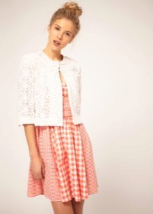 A romantic look is impossible without a beautiful dress. A white jacket will decorate the dress from any material, any length and style. The dress can be plain or printed. Shoes should match the image: beautiful shoes, graceful sandals, etc.