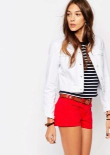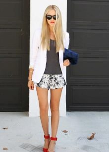 The snow-white shortened jacket of an adjacent silhouette perfectly complements the casual outfit of a T-shirt and shorts of different shades of sand color.