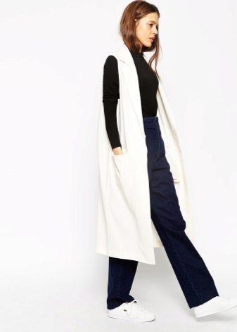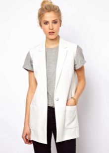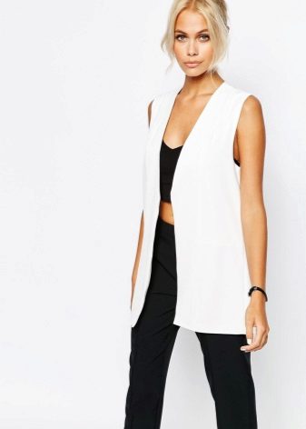 White sleeveless jackets look very unusual and stylish. Outwardly, they resemble vests. Sew from different materials, including dense costume and light, transparent fabrics.