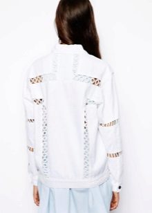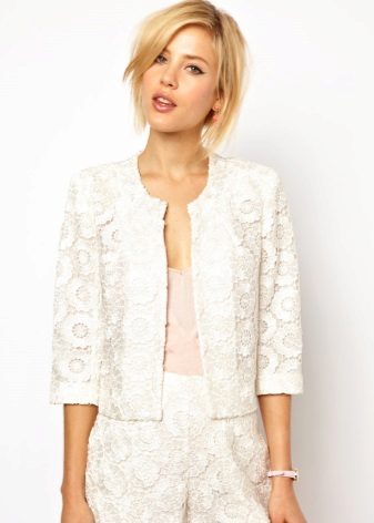 If a pure white jacket seems too uninteresting and official, then you can buy a model decorated with inserts from other materials. Jackets are often decorated with metal chains, rhinestones, beautiful embroidery in a contrasting color, etc. Such models look no less stylish and elegant than the classic jackets familiar to everyone.