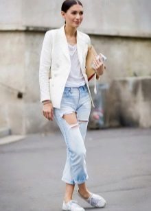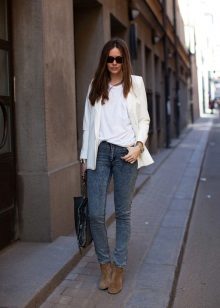 A combination of a white jacket and jeans of any style, shirt or top is perfect for creating a casual look. As a shoe, you can choose almost any option - sneakers, moccasins, slip-ons, ballet flats, shoes, wedge sandals, etc.