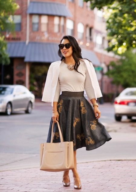 Romantic image: flesh-colored blouse + elegant fluffy skirt + concise shoes with heels. A light snow-white jacket, draped over the shoulders, looks very impressive and makes the image even more feminine.