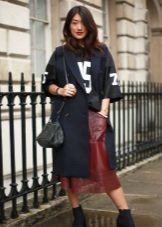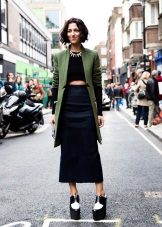 - A black jacket and a long skirt will help create a street style. Shoes with metallic decor. As accessories, choose a large bag made of crocodile leather.