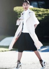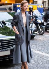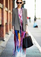 - Dress - wear a trapeze in a bright color palette with a gray jacket. Low running shoes and a large leather bag.