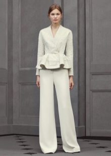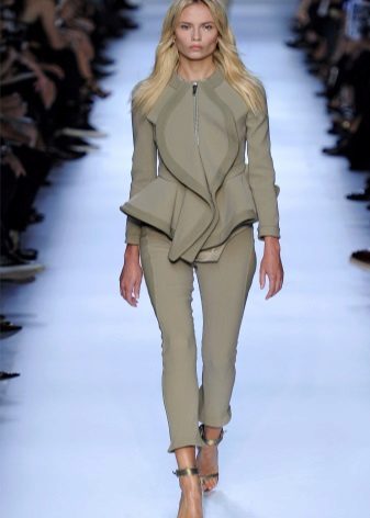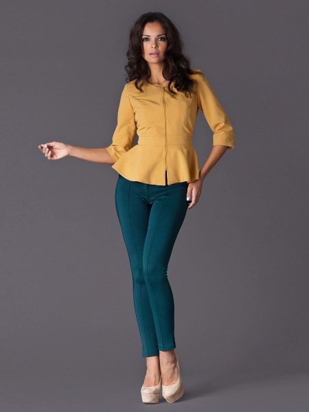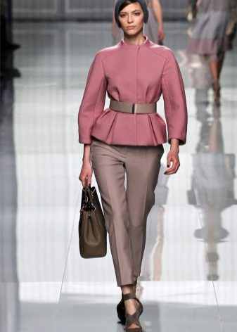 Women with lush hips are advised to try on models with a large or elongated basque. Such a style allows you to visually adjust the figure, it is beneficial to emphasize the advantages and hide its flaws. Such a jacket will look great with classic straight cut trousers.