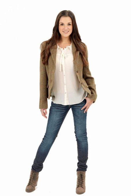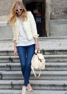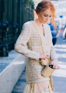 For a casual look, a tweed jacket should be worn with jeans and a snow-white blouse made of airy translucent fabric. Shoes on the platform to match the jacket perfectly complement the stylish look.