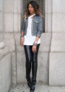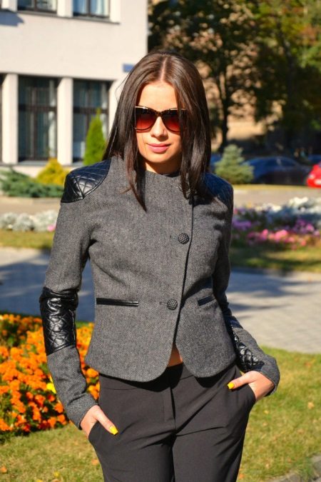 A cropped tweed jacket with leather accents looks elegant. Large buttons that are fastened diagonally give the model a spectacular look. This jacket looks beautiful in tandem with black pants of a tight-fitting cut.