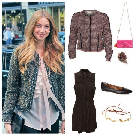The combination of a shortened tweed jacket and an airy fabric dress looks chic and romantic. Convenient black ballet shoes perfectly complement the irresistible bow. The dress can be decorated in a small floral ornament or in small polka dots. But the tweed jacket can combine several tones at once. Soft jewelry and a small handbag on a chain will perfectly harmonize with the selected outfit.