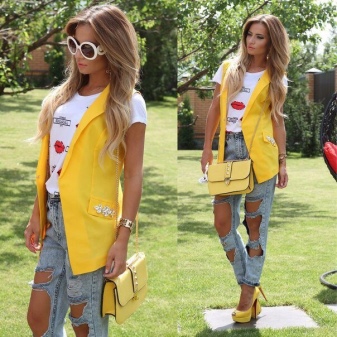 A jacket of any yellow shade is best chosen from light fabrics for the summer period. Such a jacket implies a minimum of details and other colors. Therefore, we recommend combining a yellow jacket with white items of your wardrobe, for example, a white light top or shirt with a white skirt. Some fashionistas may opt for skinny blue jeans.