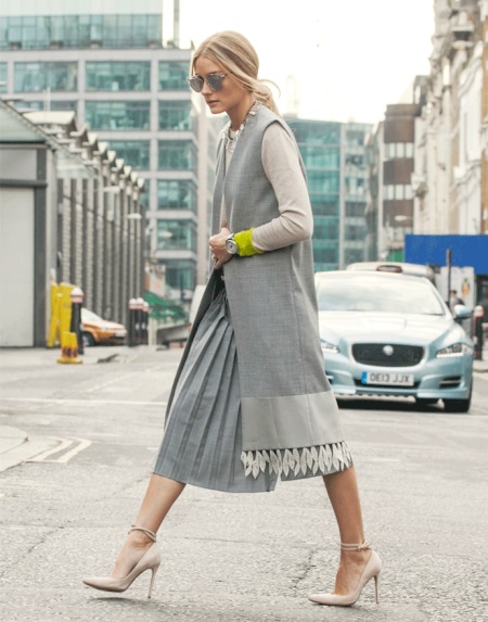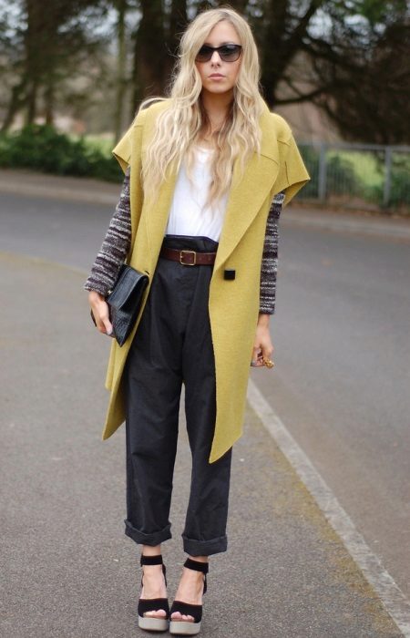 High-heeled shoes are the best choice for an ensemble with an extended sleeveless jacket.