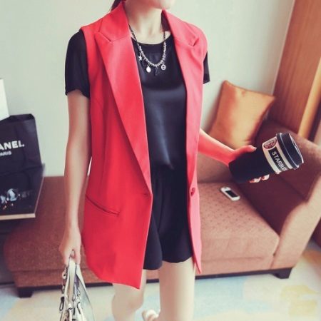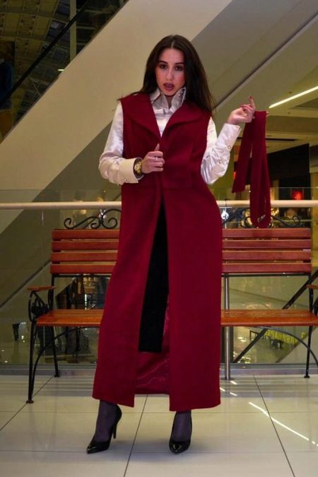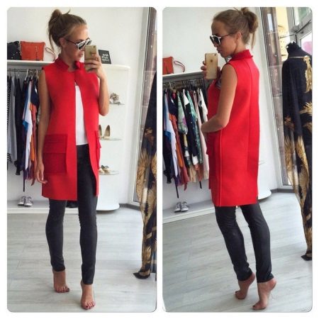 Red and its shades are always relevant. When choosing a red elongated sleeveless jacket, remember the rule of three colors.