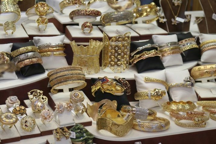 Dubai jewelery alloy jewelry is not the whole assortment that marketers can offer. Here mYou can buy various amulets, figurines, ingots, decorative items and utensils made from this material. Fans of unusual things can buy a gold swimsuit or a dummy for the baby here.