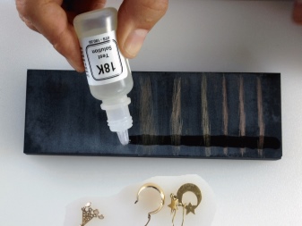 - The kit comes with bottles of acid of different concentrations, indicating the number of carats on each label. It is necessary to drop acid from the bottle with the lowest number on the scratch and evaluate the reaction.