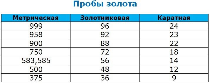 The metric system includes 375, 500, 585, 750, 900, 916, 958 samples. The carat system: 24, 23, 18, 14, 12, 9. To understand what these numbers mean, you should compare the two systems according to a special table.