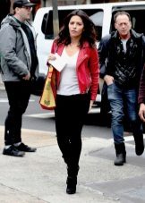 We begin the review with a very simple image, which Sarah demonstrated in 2013 at a press conference on the series “In sight”, held at the Comic-Con festival in San Diego. Although dark colors prevail here, the ensemble looks very refreshing. They make up a spectacular top with a rich floral print, black leather skinny pants and suede coral sandals with a small heel and straps in the ankle area. All elements of the costume are in good harmony with each other, since each detail has something in common with another. So, the coral color of sandals is repeated on the print of the top, the top itself is trimmed with leather inserts, which echoes the material of the trousers. And finally, even such an accessory as a watch has gold details, and this is the intersection with the top zipper made in gold.