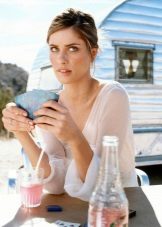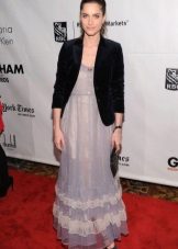 Quite often, translucent fabrics are found in Amanda Pete's outfits. And one of the most successful options can be considered dresses made of such smoky-colored materials. The actress perfectly combines them with black and white elements, which looks very harmonious with her color type.