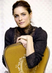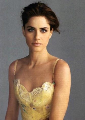 A monochrome version of the evening toilet, which should be noted by all brunettes: a delicate cream floor dress with lace and frills, with bare shoulders and a lace stand-up collar. Here, a miniature clutch to match the dress and contrasting makeup and manicure are very well chosen: nail polish, lipstick and eye shadow belong to the same dark palette, all colors are very saturated. In this image, Amanda again demonstrates a bunch, but this time the hairstyle is built with a parting in the middle, this option looks more respectable than smoothly licked.