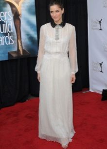 The reincarnation of the actress for the red carpet is always a bit like fairy-tale magic. For example, here is this image that Amanda demonstrates at the presentation of the next season of the series “Game of Thrones”.An elegant white dress of a fanciful cut on thin straps and with an open back turns Pete from a successful careerist and caring mother of three children into a fragile young girl waiting for her prince. The original golden clutch and the most open light beige shoes enhance the effect of tenderness and lightness of this image.