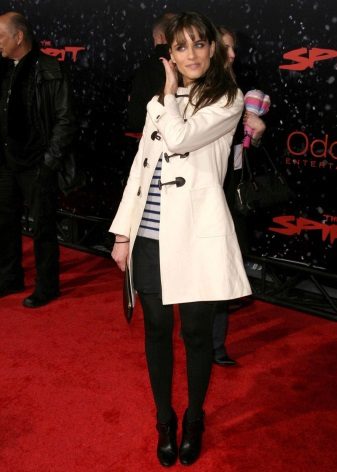 The second image with a coat casts a nautical theme: the main components are a striped black and white top and a duffle coat of a milky hue with contrasting black fittings. All other elements of this ensemble are made in black: clutch bag, skinny pants, ankle boots with rounded toes and low heels. Even make-up and manicure here make up the contrast of the main part of the outfit - the coat: the nail polish is black, the eyes are tinted using the Smokey Ice technique.