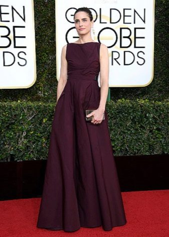 And the next outfit is made literally in the spirit of the Greek goddess: a dress on the floor of the finest flowing fabrics opens the back and shoulders. In addition to the clutch, the ensemble contains wrist bracelets, but more important here is head dyeing - a thin hoop associated with the tiara, which is what pushes the comparison with the Greek mythical beauty.