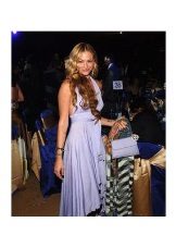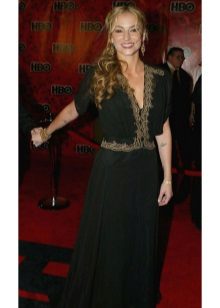 Glimpses of ethnic style often flash in the outfits of an American actress. For example, this dress would be the most ordinary and boring, but the original ethnic ornament framing the line of the belt and decollete is its juicy highlight.