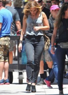 Another military style look: the central element of the composition is a camouflage T-shirt. Dark skinny, a massive brown belt resembling an army sword belt, black cardigan. The image is both simple and full of all kinds of details. For example, pendants on chains that adorn the neck of the actress make a very significant contribution to this outfit, completing it, making it more complete.
