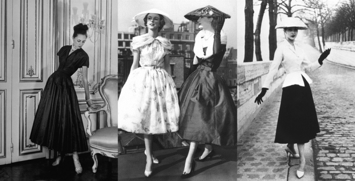 1947 - New Look - Christian Dior. This collection introduced the hourglass silhouette: rounded hips, sloping shoulders and a wasp waist became forever the embodiment of true femininity. An elegant miniature handbag, shoes with a narrow and pointed toe, and, as a finishing touch, a fluffy hairstyle or a wide-brimmed hat.