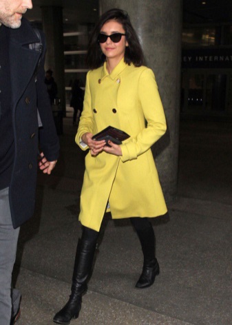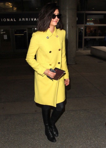 The actress demonstrates a wonderful ability to harmoniously combine in her wardrobe both a coat of classic shades and bold bright variations.