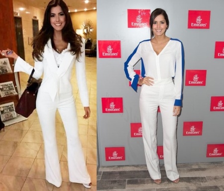 Pauline, like all dark-skinned brunettes, is very white. But not all representatives of this type of appearance can wear snow-white clothes. Those who have not yet decided to create bold total white bows should take the example of the beauty Vega. You can safely wear a white trouser suit, made in the style of the 1970s: flared pants, a jacket fitted. Fans of a more advanced style in clothing, Paulina demonstrates how to wear an ultramodern white trouser suit with geometric splashes of blue stripes.