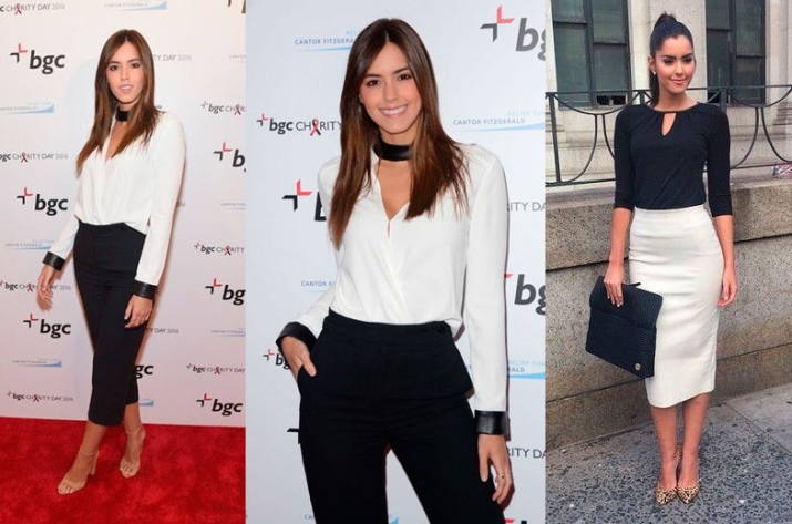 These sets, compiled on the principle of "white top, black bottom", are all different and original, and all could take their rightful place in the everyday wardrobe of a business woman.