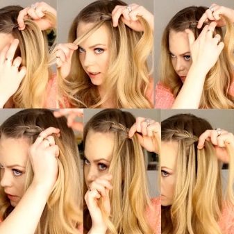 - en su base, seleccione tres mechones finos de cabello, trence una trenza ordinaria, moviendo el cabello con una superposición en ambos lados: la trenza debe ser ligera y voluminosa;