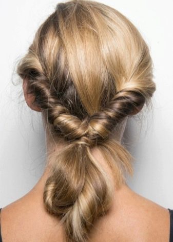 - Recolectamos el cabello en la parte posterior de la cabeza, lo envolvemos hacia adentro y lo arreglamos. El resultado es un torniquete en la parte trasera y un volumen exuberante en la parte delantera.