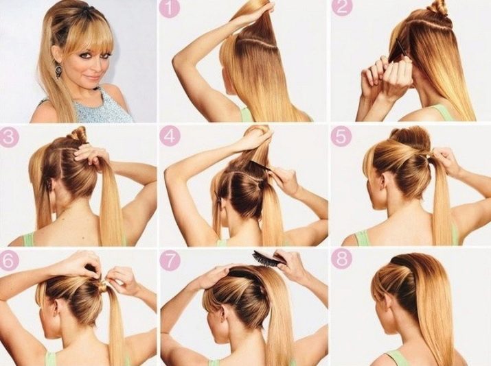 - recogemos el pelo restante en una cola apretada y alta, asegurándolo con una banda elástica;
