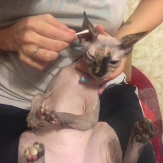 Salaisuus kertyy peterbolds-korvien korviin, mutta omistajan ei tarvitse tästä johtua paniikkia ja yrittää puhdistaa se päivittäin puuvillanupilla. Riittää, kun teet tämän kerran 7 päivän välein, kun olet ostanut erikoisvoiteen eläinlääkeapteekista. Samalla voiteella sinun on pyyhittävä kynsien väliset alueet (rasvakerrostumien kertyminen estää kissan liikkumista).