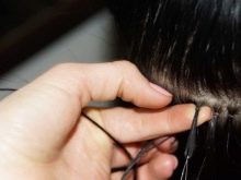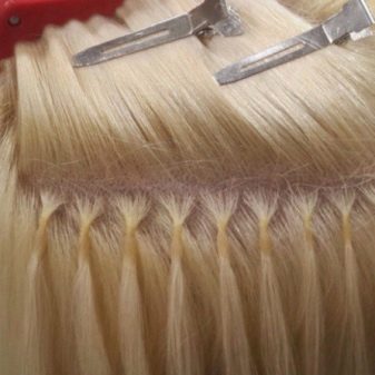 - Hypoallergeeninen liima - ns espanjalainen menetelmä. Samalla voit löytää yhteyspisteen vain koskettamalla. Lisättyjen säikeiden lukumäärä on 200-230 kappaletta. Puristetut ja litistetyt liimakapselit kuivumisen jälkeen muuttuvat vaaleaksi. Siksi tämä menetelmä, joka on hyvin todistettu blondeille ja tytöille, joilla on tummat hiukset, ei toimi.