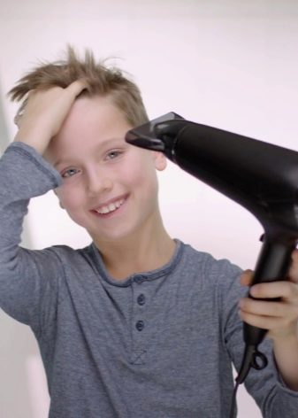 Tilavuusmuotoilu on myös helppoa. Valmistele ensin hiustenkuivaaja ja harja - sen hampaat eivät saa naarmuuntuneita ja aiheuttaa lapselle epämukavuutta. Jos puhaltaa hiuksesi ensimmäistä kertaa, anna pojan mukavasti. Kytke laite päälle ja pois, ohjaa ilma hänen käsiinsä - lämpötilan tulee olla mukava. Tarvittavat säikeet tulisi nostaa juurista ja kuivata.