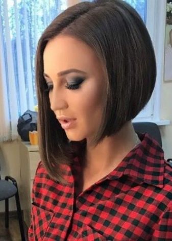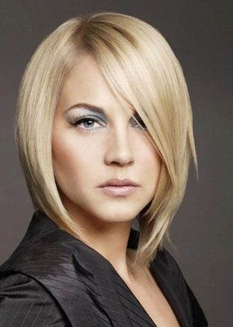 - Yksisuuntainen vino hiuksenleikkaus Täydellinen tytöille, joilla on kaikenlaiset kasvot ja suorat kiharat. Kaltevien tukkien takia pitkänomaisten poskiluiden puutteet piilotetaan, ja tytöille, joiden kasvot ovat pyöreät, tämä hiuksen pituus pidentää hiukan muotoaan.