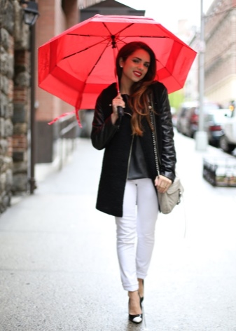 Rikas lisävaruste näyttää hyvältä yrityspukujen tai naisten takkien kanssa valkoisena, kermana, karamellina ja mustana. Sateenvarjo luo tietyn tasapainon tällaisissa sarjoissa.