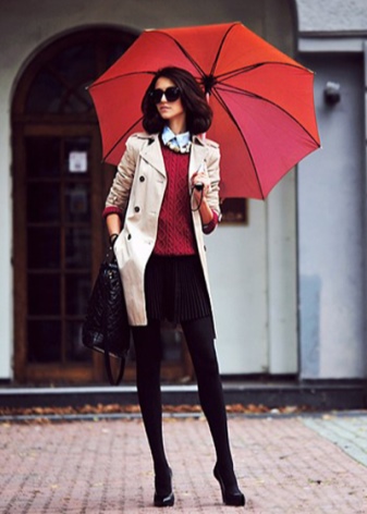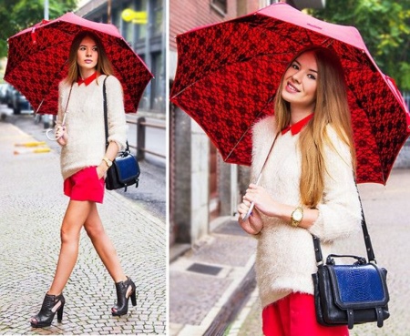 Vaaleiden vaatteiden osien tulee olla päällekkäin kuvan kanssa. Voit tehdä tämän, jos sinulla on villapaita, jossa on kirkas scarlet-kaulus, klassiset housut ja terävät kengät. Tällaisella sarjalla punaisen sateenvarjo ei näytä vaikuttavalta, vaan myös muodikkaan Marsala-värin tuotteen. Asu, jossa on geometrinen tai kukkapainatus, on yhtä harmoninen sen kanssa.
