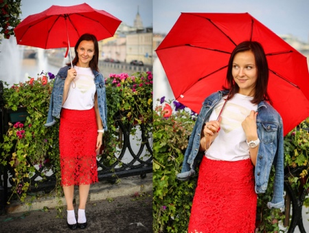 Flirttailemalla hameella tai shortseilla voit pukeutua tyylikkääseen paitaan, puseroon, tunikaan tai yläosaan ja täydentää tätä kokonaisuutta scarlet-sateenvarjolla.