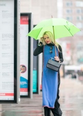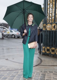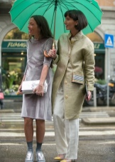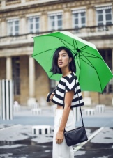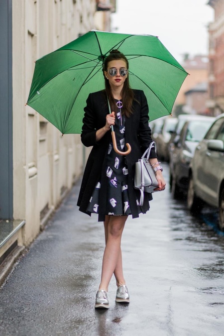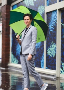 Jos sateenvarjo on maalattu tummempiin vihreisiin sävyihin, se sopii täydellisesti naisilla päällysteillä neutraaleilla harmaailla ja klassisilla mustilla kenkillä. Tähän on mahdollista sisustaa ja antaa raikkautta ja kirkkautta paitsi kauniilla vaaleanvihreällä sateenvarjolla, mutta myös herkällä salaattivärihuivilla.