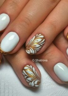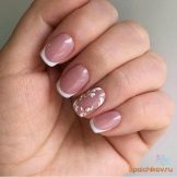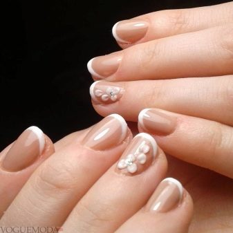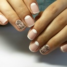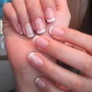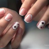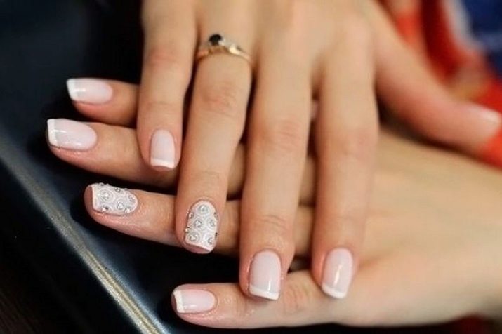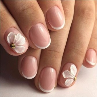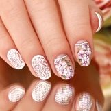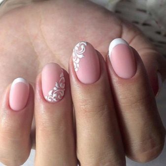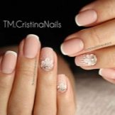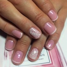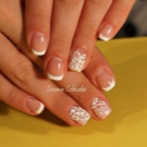 - Des motifs raffinés doux, par exemple des motifs floraux, conviendront à la manucure française. La dentelle a aussi fière allure avec une veste. Une bonne idée est juste de la dentelle blanche en combinaison avec des strass sur les ongles sans nom et du milieu, tandis que le reste restera dans un style français.