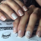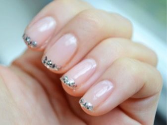 Les paillettes sont souvent utilisées en français. Vous pouvez souligner avec un tel vernis au gel la partie envahie de la plaque à ongles ou couvrir toute la manucure avec un agent translucide étincelant au stade final.