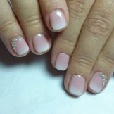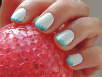 La transition douce de la couleur naturelle de l'ongle à la pointe blanche est l'ombre. Ils le font à l'aide d'une éponge ordinaire, en appliquant deux couleurs côte à côte et en l'appuyant sur l'ongle. Le vernis gel imprimé sur l'ongle est fixé avec une lampe spéciale, et la peau tachée est simplement nettoyée. Bien que les coûts de main-d'œuvre pour effectuer une telle manucure augmentent considérablement, mais cela en vaut la peine.