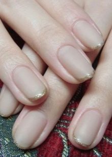 Vous pouvez ajouter un peu de texture à une manucure plutôt conservatrice à l'aide de frottements spéciaux pour le vernis gel et de moyens tels que le «sucre». Avec leur aide, vous pouvez obtenir l'effet d'une manucure de soulagement. Pour un français, vous pouvez décorer l'anneau et le majeur de vos mains avec une texture, en choisissant la couleur de cet effet pour correspondre à la pointe des ongles.