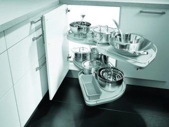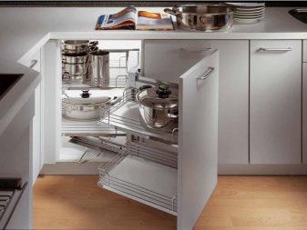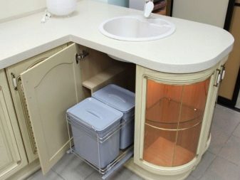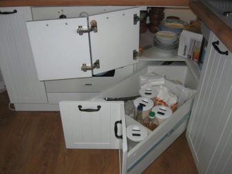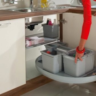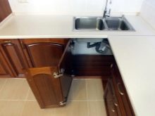 Malgré sa haute fonctionnalité, les modules d'angle pour la cuisine présentent des inconvénients. Donc, le moins est que l'espace intérieur ne pourra pas accueillir une grande poubelle pour une grande famille. De plus, les éléments d'angle des meubles de cuisine sont plus susceptibles de tomber en panne que les armoires directes.