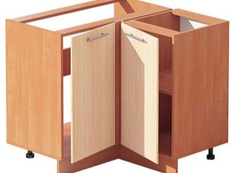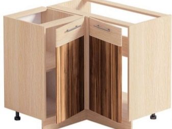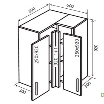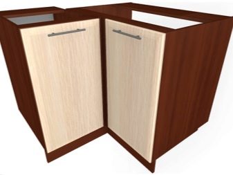 Les éléments de meubles d'angle à angle droit ont deux portes. À ce jour, les armoires doubles sont très demandées. Visuellement, le design ressemble à deux armoires. L'espace intérieur est équipé d'un système rétractable et a une grande capacité pour divers détails de cuisine.