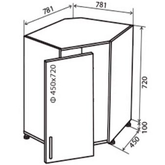 - Une armoire avec des parois latérales externes de 52 cm, des parois internes de 45 cm et un fond hexagonal. Il n'y a pas de paroi arrière dans le cadre, ce qui facilite le placement du drain et d'autres communications. Les étagères dans la conception sont également absentes.