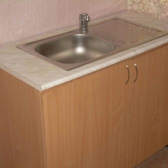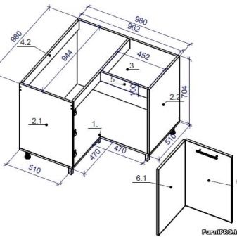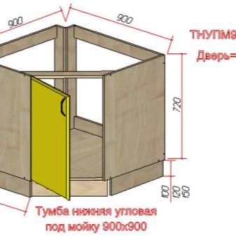 Le meuble évier, en règle générale, est choisi complet avec des meubles de cuisine. Cependant, certains modèles inclus dans le package ne semblent pas à l'intérieur. Cependant, le support d'angle peut être acheté séparément. Pour cela, il est nécessaire déterminer la taille de l'armoire d'angle et le choix de l'option appropriée.