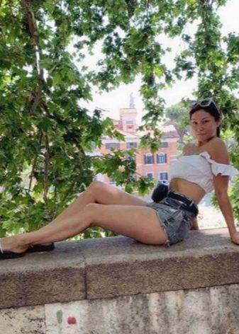 Marina a choisi un short en jean en denim artificiel, ainsi qu'un haut blanc clair qui lui ouvre les épaules.